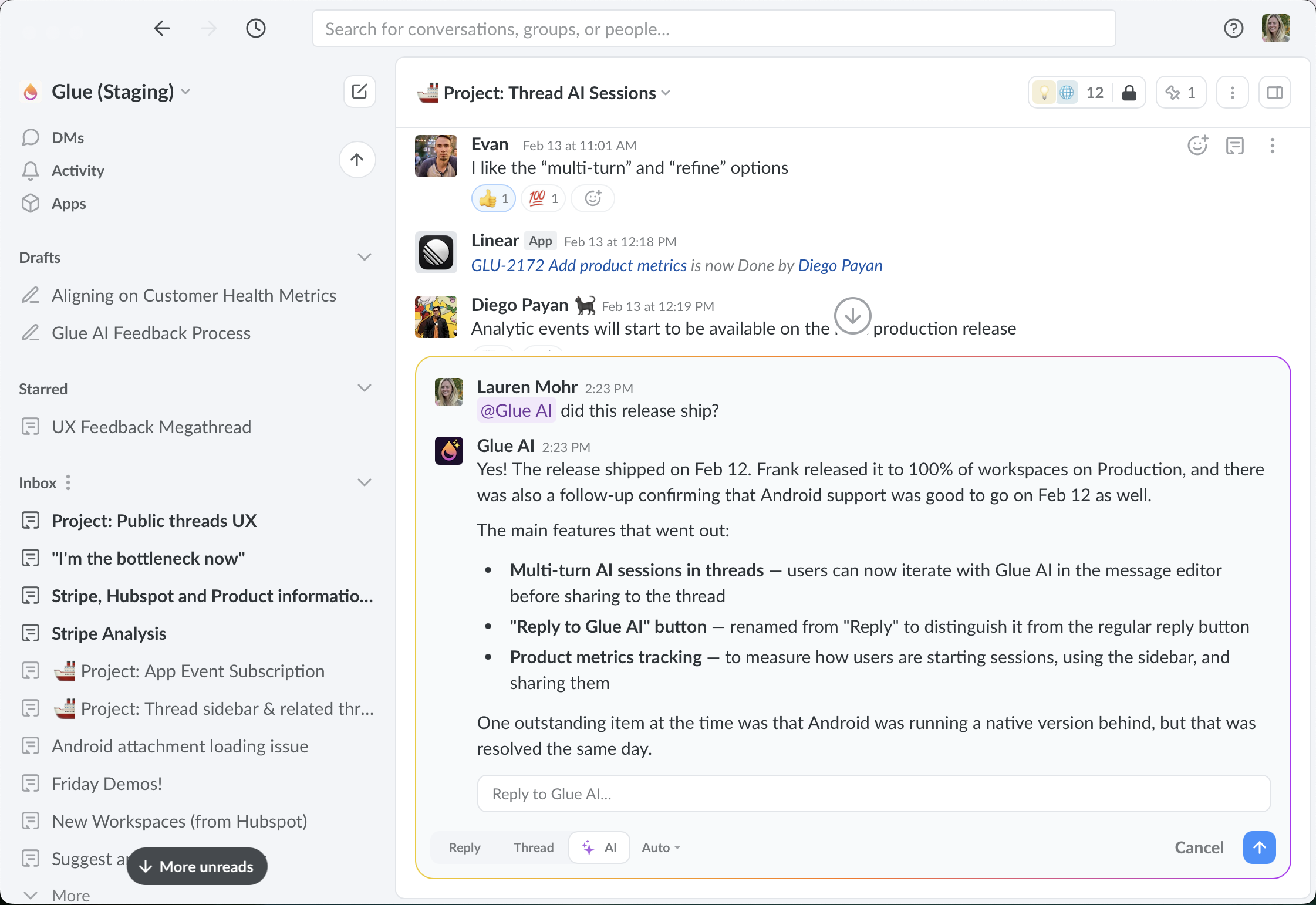* Click **Reply to Glue AI** to continue the conversation