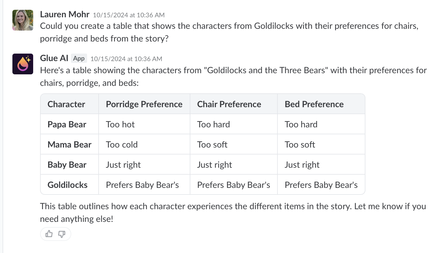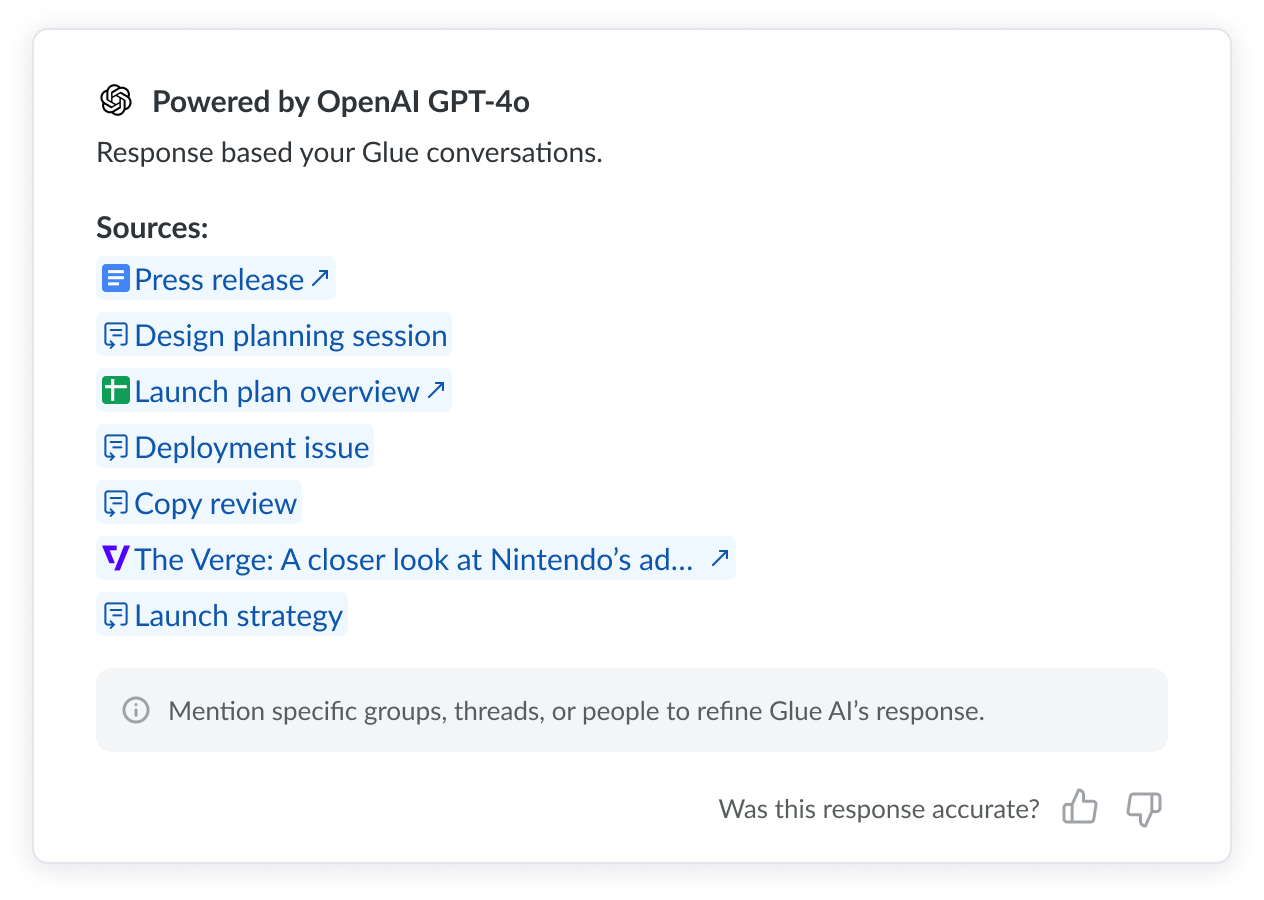 Let us know how it's going! If there's anything that is confusing about an answer from Glue AI or it isn't clear how to prompt it, we want to hear your feedback!