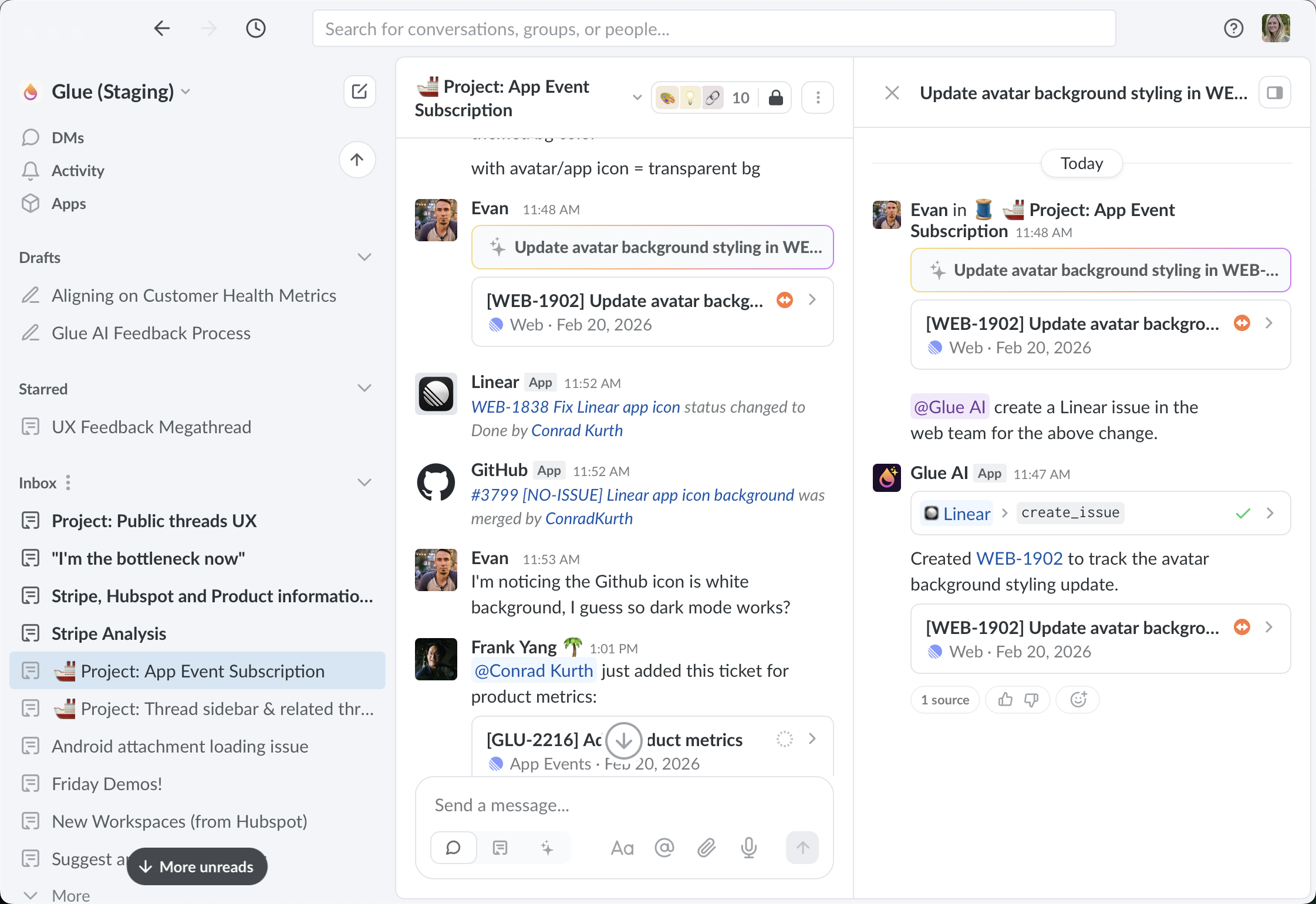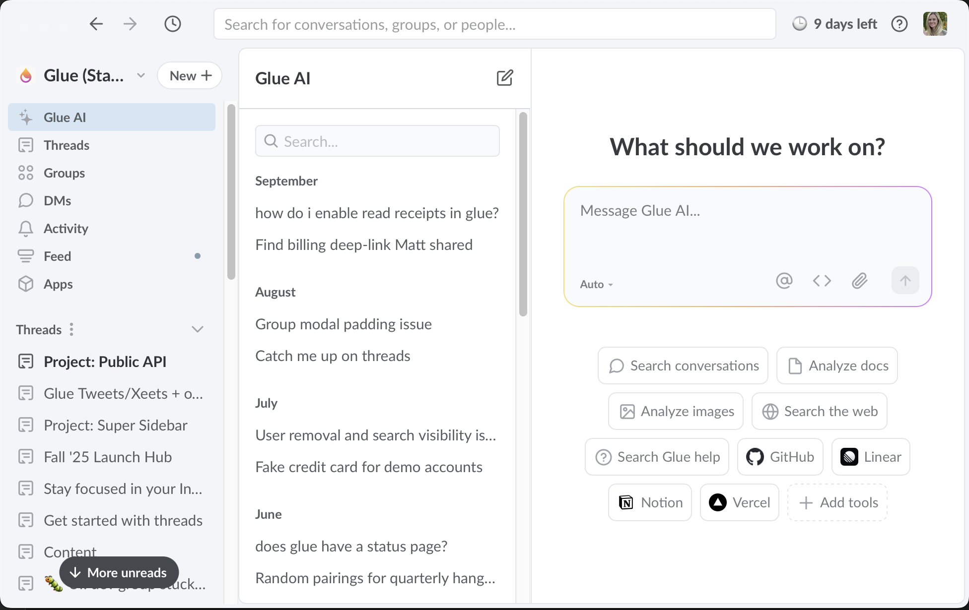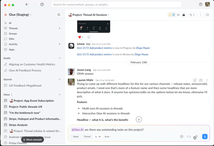 At mention @Glue AI in any message or thread, and ask a question. It will answer leveraging context from your workspace and the web. Here are the best ways to leverage Glue AI.