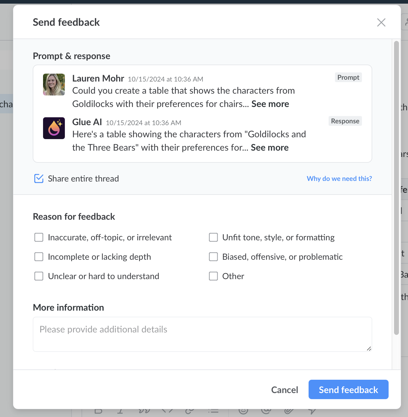 Give Glue AI as much context as you can in the prompt for more relevant answers